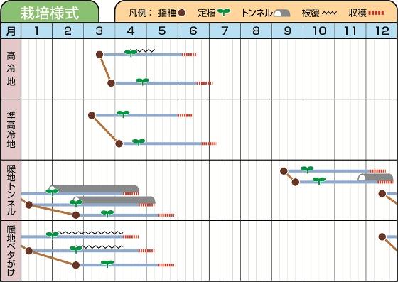 1.サリナス系×マックソイル系の交配交雑群933から低〜中温期の緩やかな結球性・耐病性を目的とした系統番号11。