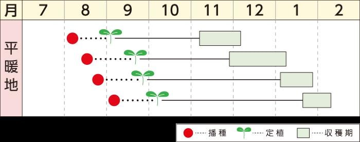●8月上旬まき11月中旬〜下旬どり。8月中下旬まき12月中旬〜1月どり。暖地では9月上旬まきの2月どりにも利用できる。
